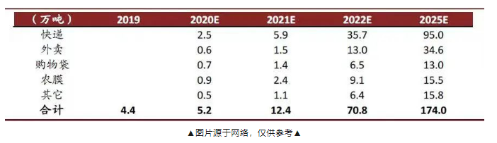 2019年我國塑料制品產(chǎn)量達(dá)到8184.2萬噸,約占全球總產(chǎn)量23%左右。其中我國僅塑料袋年使用量即超過了400萬噸,此外外賣和快遞行業(yè)的加速發(fā)展正在加劇這一問題。與此形成鮮明對比的是,2019年我國可降解塑料實(shí)際用量僅4.4萬噸,可降解塑料在塑料制品中占比不足1%。由于工程塑料對性能要求更高、且回收更為容易,可降解塑料的推廣將更加依賴于民用領(lǐng)域。專業(yè)機(jī)構(gòu)根據(jù)不同終端需求以及相對應(yīng)的滲透率測算,預(yù)計至2022年末我國可降解塑料需求提升至70.8萬噸,至2025年進(jìn)一步達(dá)到174.0萬噸。